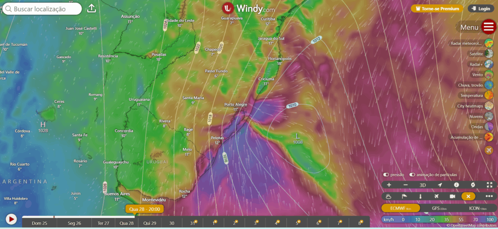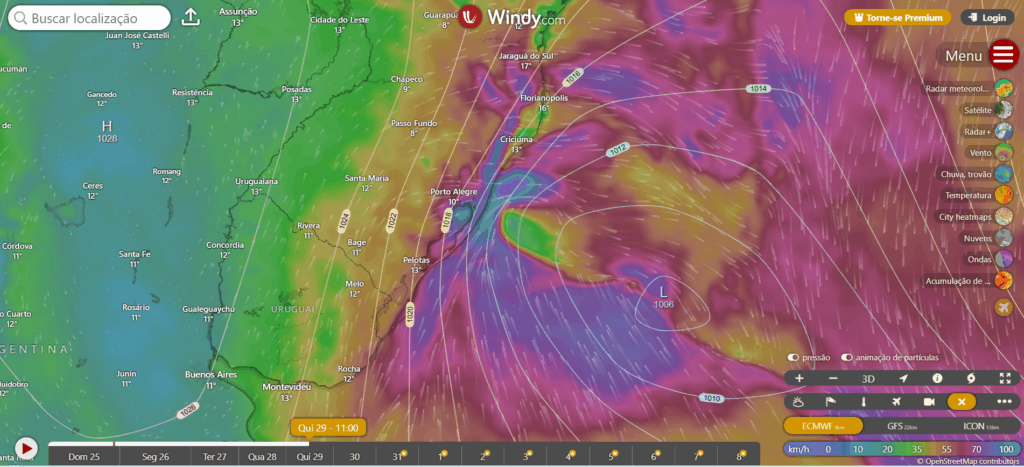As imagens do windy.com abaixo mostram a gênesi do ciclone extratropical no sul do Brasil e as rajadas de vento.
