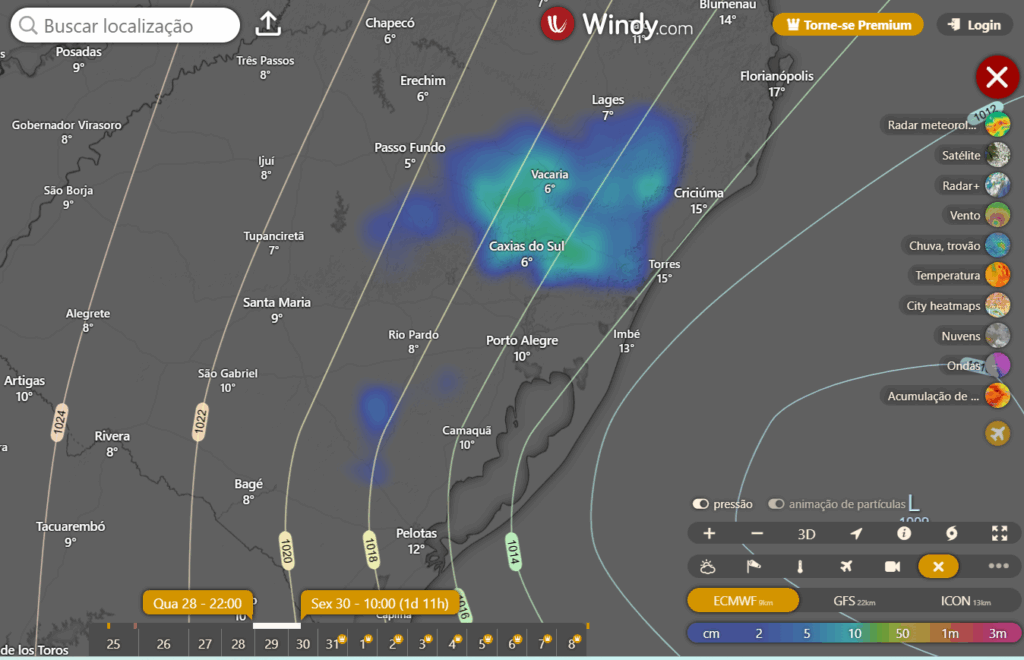 Deixo abaixo a simulação do windy.com para neve no sul do Brasil