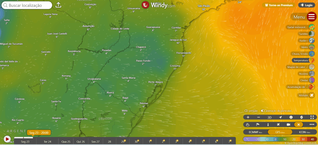 A noite de segunda feira será gelada no sul do Brasil, quem estiver na campanha Gaúcha sentirá temperaturas de 3 a 4 °C já nesta noite. Aqui no sul Catarinense as 20h já teremos temperaturas abaixo de 10 °C. No mapa temos as demais cidades e suas temperaturas.