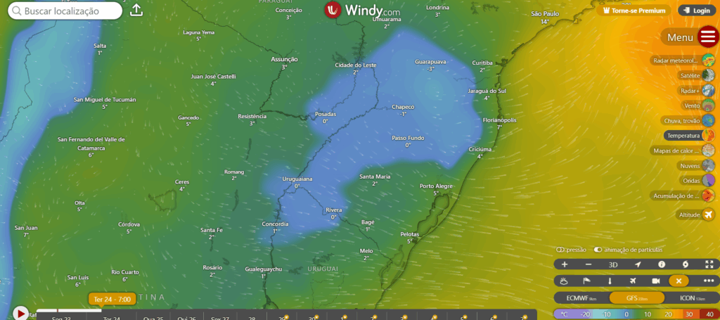 As próximas madrugadas de terça e quarta feira serão de temperaturas muito baixas em todo sul do Brasil, potente massa de ar frio toma conta de todas as regiões derrubando as temperaturas. Podemos ver na simulação abaixo as temperaturas projetadas para o sul do Brasil.