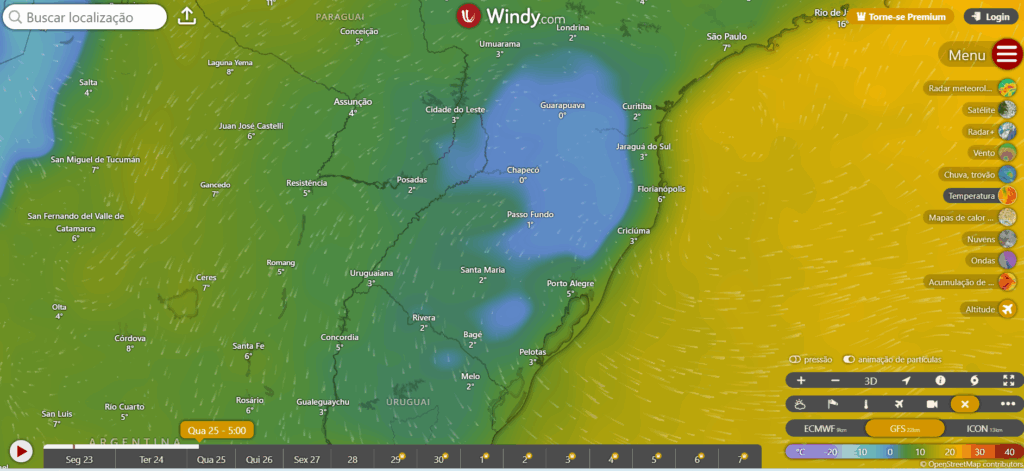Na terça feira pela manhã haverá temperaturas ao redor de 0 °C no sul catarinense com chance de geada em alguns pontos mais afastados da cidade. A coloração azul no mapa mostra as temperaturas abaixo de 0 °C no sul do Brasil, na serra catarinense as temperaturas mínimas tem potencial de chegar a – 7 °C com geada ampla nos campos, no RS a serra também terá temperaturas muito baixas.