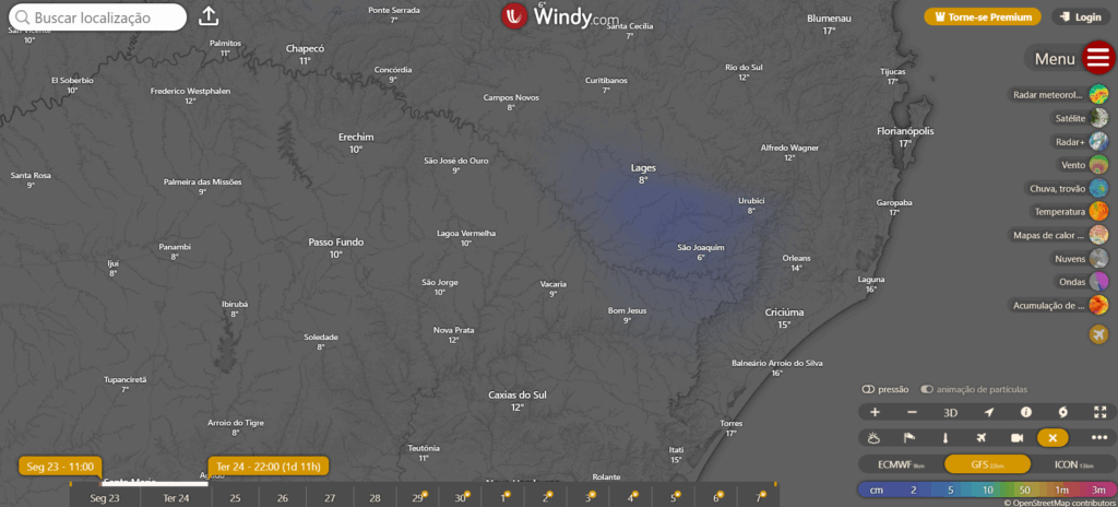 A simulação indica neve agora a tarde na serra catarinense, novamente.