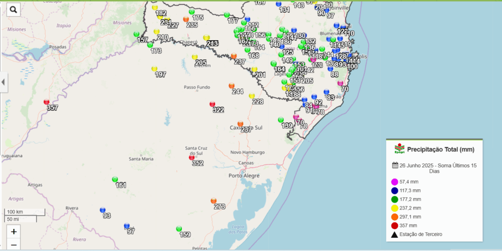 Esta semana que está quase no fim, escrevo aqui na quinta feira de noite, dia 26 de junho, quase o final do mês. O solstício de inverno aconteceu na semana passada, dia 20, marcando a chegada do inverno astronômico. Esta estação chegou diferente dos últimos invernos, muito frio no sul do Brasil, madrugadas geladas e muita geada em vários municípios. Aqui na cidade de Criciúma os termômetros chegaram a: – 0,8 °C no bairro Sangão (epagri-unesc); 2,0 °C no campus UNESC e 5,6 °C na região central no colégio marista. Estes dados são relativos ao amanhecer de quarta feira, dia 25 de junho. No RS, continuamos com estado de alerta, muita chuva ocorreu nos últimos dias provocando novamente cheia dos rios na região central de também na grande Porto Alegre. Na sequência vou deixar os dados de precipitação para vermos o tamanho do problema que está acontecendo no nosso estado vizinho.