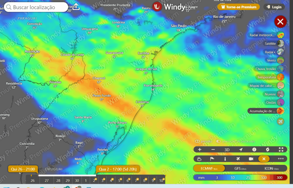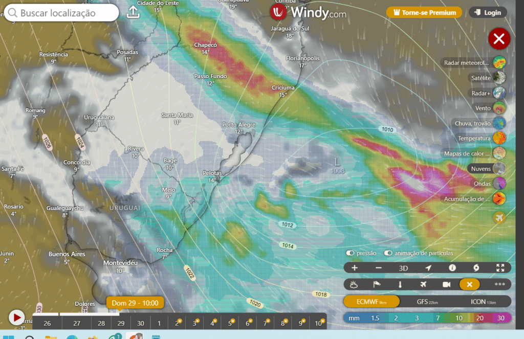 A projeção para os próximos dias não é nada boa para nossos irmãos Gaúchos , conforme a simulação do windy.com, abaixo: