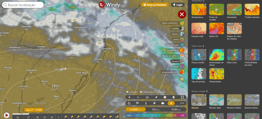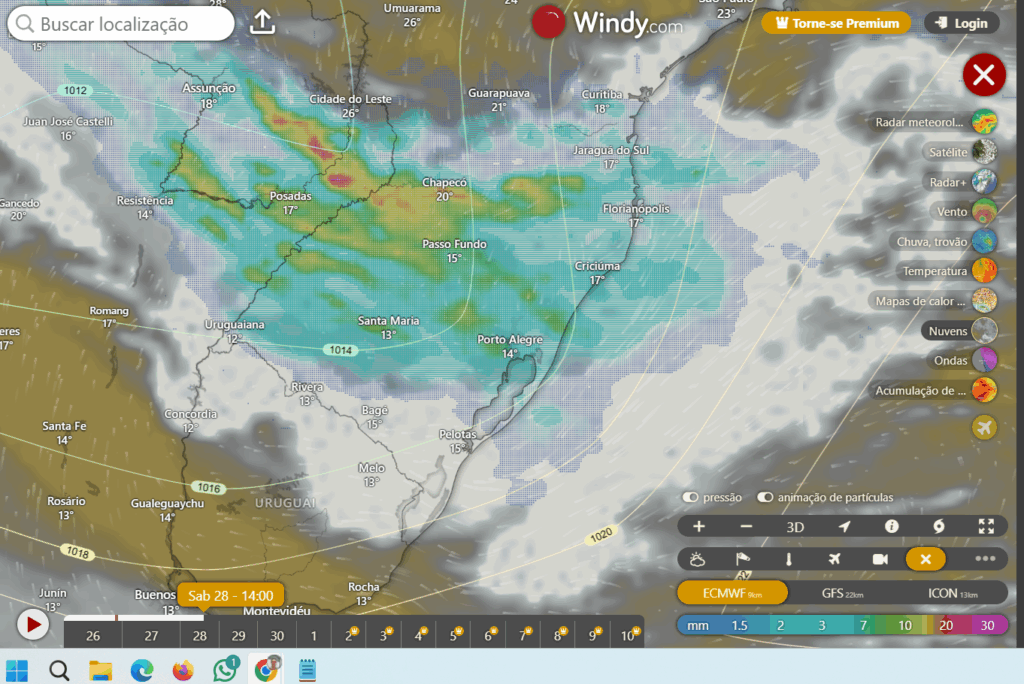 Para o sábado no sul do Brasil muita instabilidade, conforme o mapa do windy
