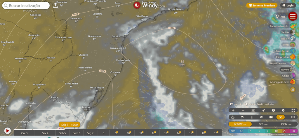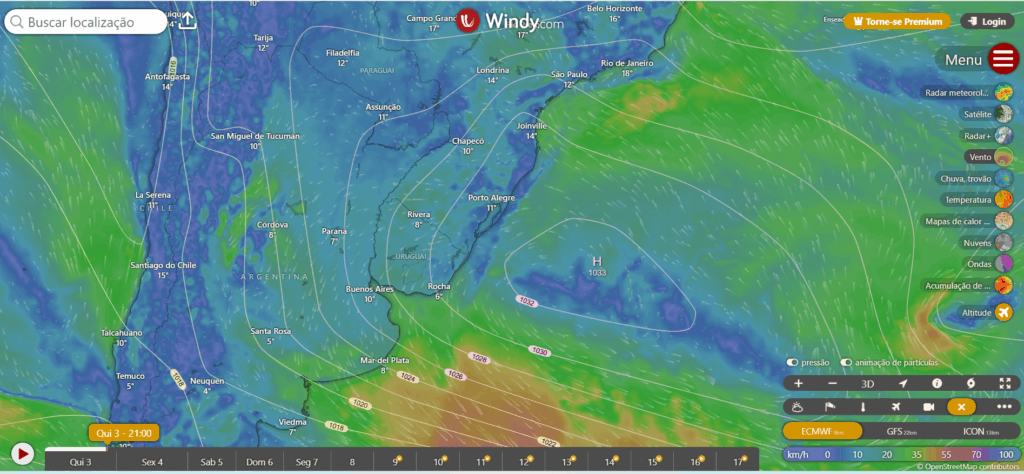Na figura abaixo mostro a simulação dos ventos e da pressão para o nosso sul do Brasil.