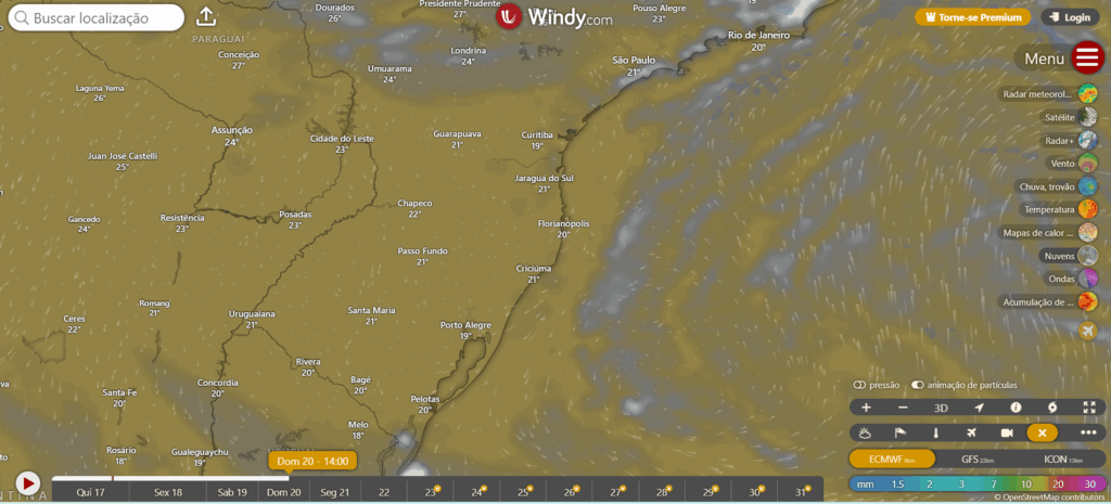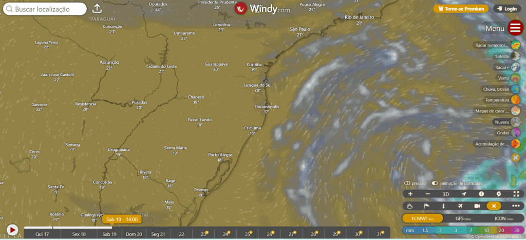 Tempo muito bom no sábado em todo sul do Brasil, entrada de massa de ar fria e seca traz tempo bom para todas as regiões, madrugadas frias, principalmente nas serras entre sexta feira e segunda. A entrada deste ar frio pode ocasionar vento um pouco mais forte, principalmente no litoral da região sul.