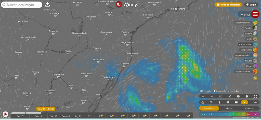 A imagem acima mostra o quadro da sexta feira, com a entrada de vento sul e frio, alguma chuva na grande Porto Alegre e aqui em SC sem chuva, temperatura entre 8 e 18 °C.
