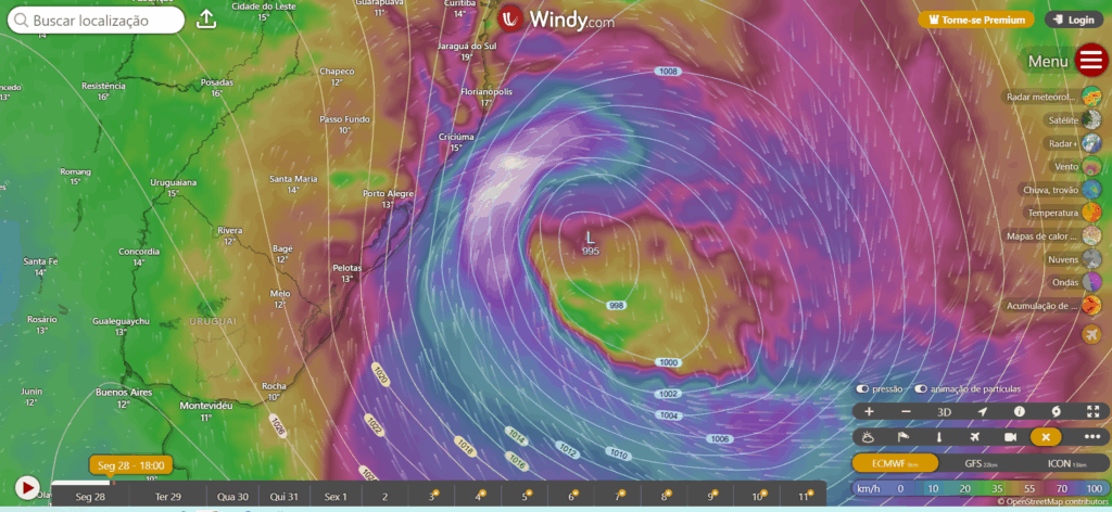 Acompanhamos nesta segunda feira a chegada de uma baixa pressão que se tornou um ciclone extratropical na costa do RS, este sistema iniciou com ventos fortes no litoral do RS, pela manhã nesta segunda e depois disso, já ao meio dia, os ventos chegaram ao litoral sul catarinense, planalto sul e serras gaúcha e catarinense.