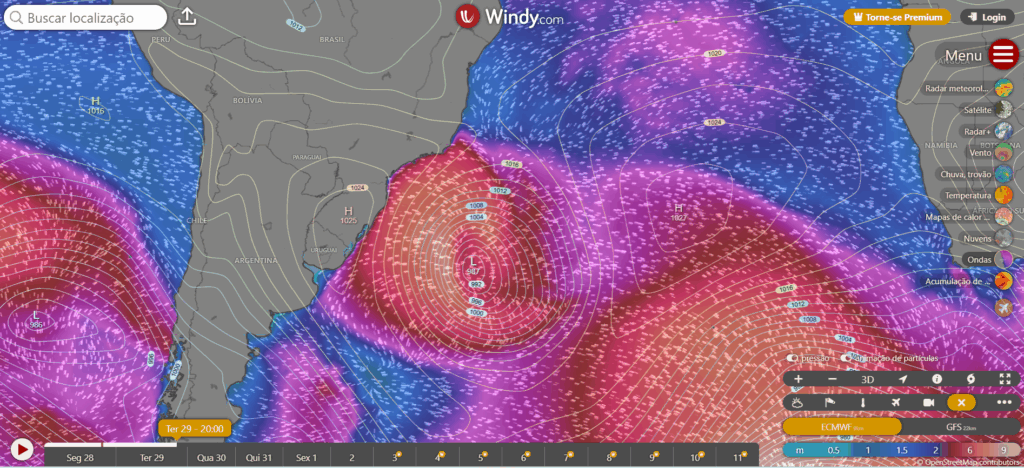 Percebemos que ainda tem bastante vento nas costas do RS e SC, mas a medida que o ciclone segue seu caminho os ventos vão diminuindo de intensidade. Ali naquela parte mais branca estão sendo registrados ventos de 160 km/h em alto mar, por isso teremos uma grande ressaca no mar, inclusive até nas praias do RJ.