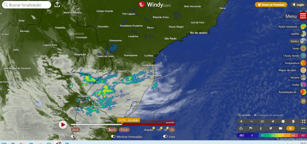 O ciclone já formado na costa no Uruguay, antes disso ele traz bastante chuva para o RS, depois das 10h de quarta feira podemos ter alguma chuva também aqui em Criciúma, mas de qualquer forma a quarta será quente aqui no sul catarinense.