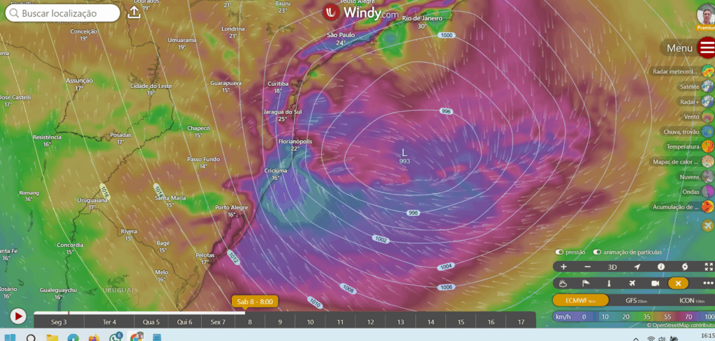 Sempre quando os modelos mostram a possibilidade de tempo severo, neste caso, um ciclone extratropical com uma pressão no centro um pouco menor do que o normal, vai produzir muita chuva e bastante vento ao longo da costa do RS e SC a partir da sexta feira.