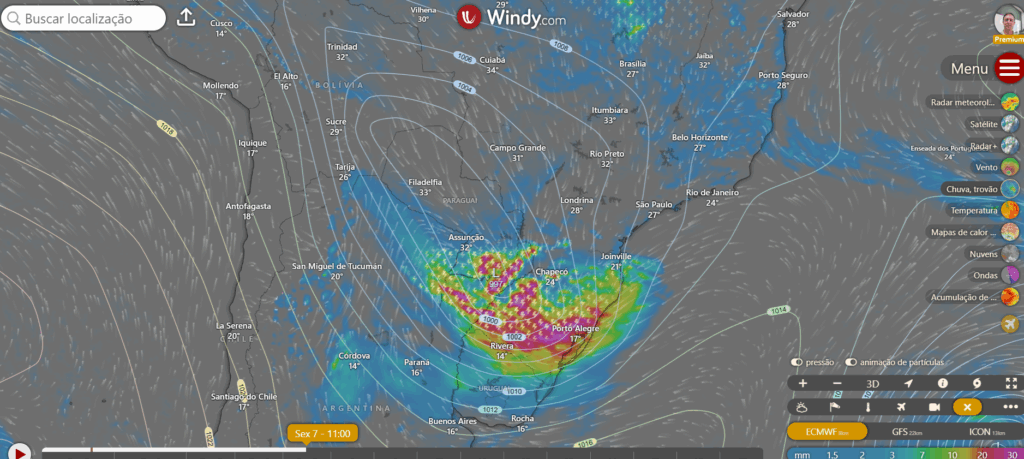 Vamos acompanhar dia a dia a evolução dos modelos, tanto de vento, quanto de chuva para este evento característico da região sul do Brasil, e que em algumas vezes atinge níveis preocupantes, com simulações indicando ventos de 110 km/h no litoral do RS e SC.